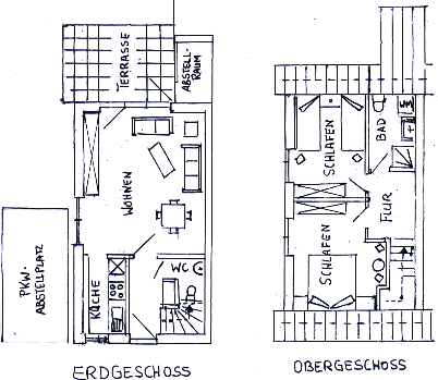 Es ist ca. 70 qm groß mit Küche, Wohnzimmer und Gäste-WC im Erdgeschoss sowie zwei Schlafräumen und Duschbad im Obergeschoss.